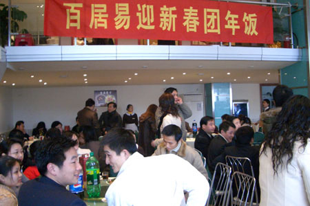 2005年2月1日,百居易房屋超市總部在香港路上香路香酒店宴請全體連鎖店店長,大家一起熱熱鬧鬧的吃了一個團年飯。席間一片歡聲笑語,百居易董事長耿開明、總經理謝娟和國佳集團領導親自到席間與每一位店長暢飲,把整個團年飯的氣氛推向高潮。